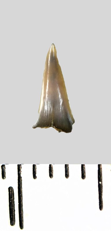 Зуб (фрагмент). Акула. Lamniformes gen. et sp. indet. Классификация: Хордовые Chordata, Позвоночные Vertebrata, Хрящевые рыбы Chondrichthyes, Пластиножаберные Elasmobranchii, Акулы Selachii, Ламнообразные Lamniformes