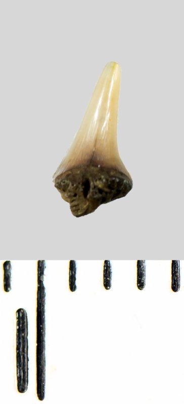 Зуб (фрагмент). Акула. Lamniformes gen. et sp. indet. Классификация: Хордовые Chordata, Позвоночные Vertebrata, Хрящевые рыбы Chondrichthyes, Пластиножаберные Elasmobranchii, Акулы Selachii, Ламнообразные Lamniformes