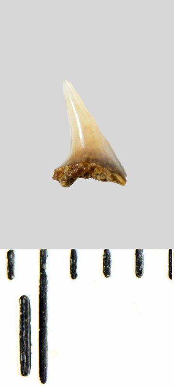 Зуб (фрагмент). Акула. Lamniformes gen. et sp. indet. Классификация: Хордовые Chordata, Позвоночные Vertebrata, Хрящевые рыбы Chondrichthyes, Пластиножаберные Elasmobranchii, Акулы Selachii, Ламнообразные Lamniformes