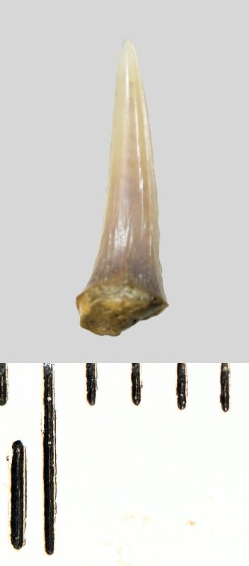 Зуб (фрагмент). Акула. Lamniformes gen. et sp. indet. Классификация: Хордовые Chordata, Позвоночные Vertebrata, Хрящевые рыбы Chondrichthyes, Пластиножаберные Elasmobranchii, Акулы Selachii, Ламнообразные Lamniformes