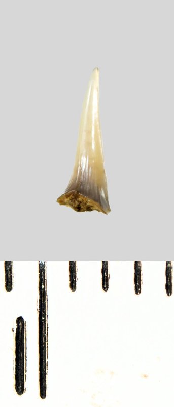 Зуб (фрагмент). Акула. Lamniformes gen. et sp. indet. Классификация: Хордовые Chordata, Позвоночные Vertebrata, Хрящевые рыбы Chondrichthyes, Пластиножаберные Elasmobranchii, Акулы Selachii, Ламнообразные Lamniformes