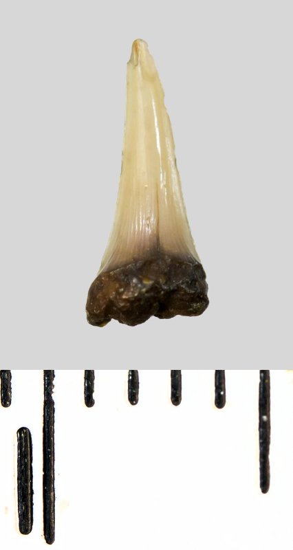Зуб (фрагмент). Акула. Lamniformes gen. et sp. indet. Классификация: Хордовые Chordata, Позвоночные Vertebrata, Хрящевые рыбы Chondrichthyes, Пластиножаберные Elasmobranchii, Акулы Selachii, Ламнообразные Lamniformes
