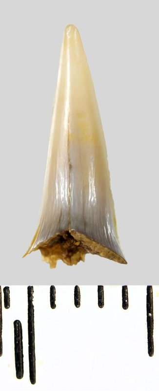 Зуб (фрагмент). Акула. Lamniformes gen. et sp. indet. Классификация: Хордовые Chordata, Позвоночные Vertebrata, Хрящевые рыбы Chondrichthyes, Пластиножаберные Elasmobranchii, Акулы Selachii, Ламнообразные Lamniformes