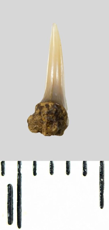 Зуб (фрагмент). Акула. Lamniformes gen. et sp. indet. Классификация: Хордовые Chordata, Позвоночные Vertebrata, Хрящевые рыбы Chondrichthyes, Пластиножаберные Elasmobranchii, Акулы Selachii, Ламнообразные Lamniformes