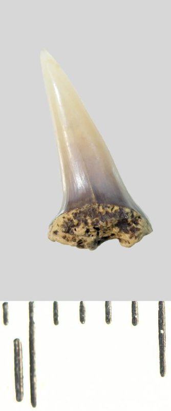 Зуб (фрагмент). Акула. Lamniformes gen. et sp. indet. Классификация: Хордовые Chordata, Позвоночные Vertebrata, Хрящевые рыбы Chondrichthyes, Пластиножаберные Elasmobranchii, Акулы Selachii, Ламнообразные Lamniformes