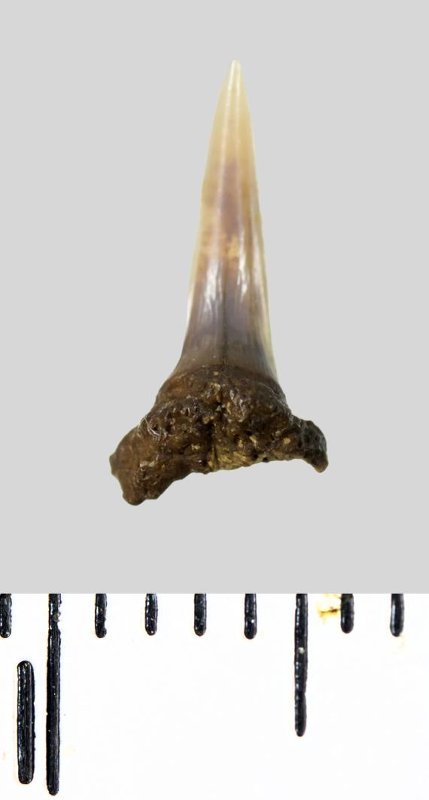 Зуб (фрагмент). Акула. Lamniformes gen. et sp. indet. Классификация: Хордовые Chordata, Позвоночные Vertebrata, Хрящевые рыбы Chondrichthyes, Пластиножаберные Elasmobranchii, Акулы Selachii, Ламнообразные Lamniformes