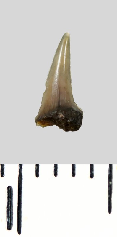 Зуб (фрагмент). Акула. Lamniformes gen. et sp. indet. Классификация: Хордовые Chordata, Позвоночные Vertebrata, Хрящевые рыбы Chondrichthyes, Пластиножаберные Elasmobranchii, Акулы Selachii, Ламнообразные Lamniformes