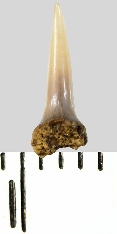 Зуб (фрагмент). Акула. Lamniformes gen. et sp. indet. Классификация: Хордовые Chordata, Позвоночные Vertebrata, Хрящевые рыбы Chondrichthyes, Пластиножаберные Elasmobranchii, Акулы Selachii, Ламнообразные Lamniformes