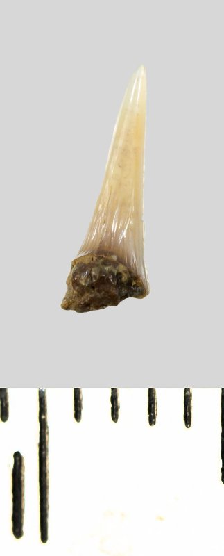 Зуб (фрагмент). Акула. Lamniformes gen. et sp. indet. Классификация: Хордовые Chordata, Позвоночные Vertebrata, Хрящевые рыбы Chondrichthyes, Пластиножаберные Elasmobranchii, Акулы Selachii, Ламнообразные Lamniformes