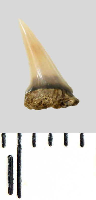 Зуб (фрагмент). Акула. Lamniformes gen. et sp. indet. Классификация: Хордовые Chordata, Позвоночные Vertebrata, Хрящевые рыбы Chondrichthyes, Пластиножаберные Elasmobranchii, Акулы Selachii, Ламнообразные Lamniformes