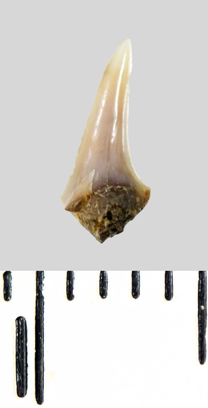 Зуб (фрагмент). Акула. Lamniformes gen. et sp. indet. Классификация: Хордовые Chordata, Позвоночные Vertebrata, Хрящевые рыбы Chondrichthyes, Пластиножаберные Elasmobranchii, Акулы Selachii, Ламнообразные Lamniformes