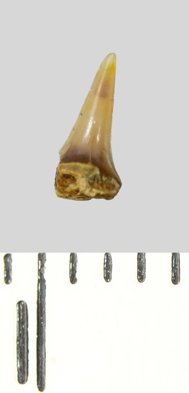 Зуб (фрагмент). Акула. Lamniformes gen. et sp. indet. Классификация: Хордовые Chordata, Позвоночные Vertebrata, Хрящевые рыбы Chondrichthyes, Пластиножаберные Elasmobranchii, Акулы Selachii, Ламнообразные Lamniformes
