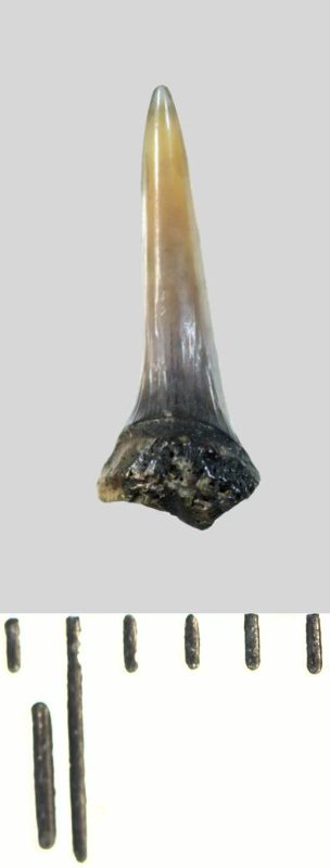 Зуб (фрагмент). Акула. Lamniformes gen. et sp. indet. Классификация: Хордовые Chordata, Позвоночные Vertebrata, Хрящевые рыбы Chondrichthyes, Пластиножаберные Elasmobranchii, Акулы Selachii, Ламнообразные Lamniformes