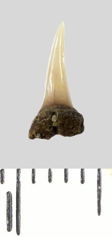 Зуб (фрагмент). Акула. Lamniformes gen. et sp. indet. Классификация: Хордовые Chordata, Позвоночные Vertebrata, Хрящевые рыбы Chondrichthyes, Пластиножаберные Elasmobranchii, Акулы Selachii, Ламнообразные Lamniformes