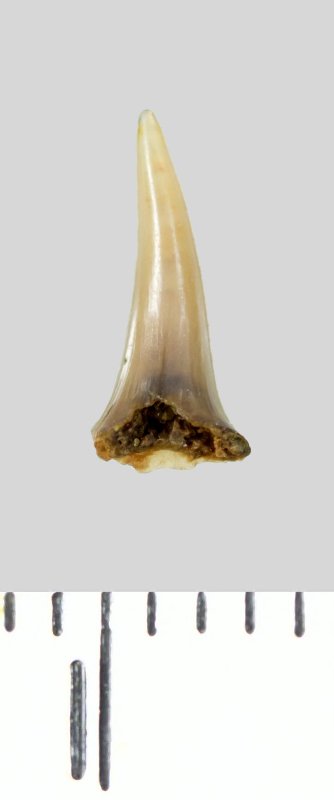 Зуб (фрагмент). Акула. Lamniformes gen. et sp. indet. Классификация: Хордовые Chordata, Позвоночные Vertebrata, Хрящевые рыбы Chondrichthyes, Пластиножаберные Elasmobranchii, Акулы Selachii, Ламнообразные Lamniformes