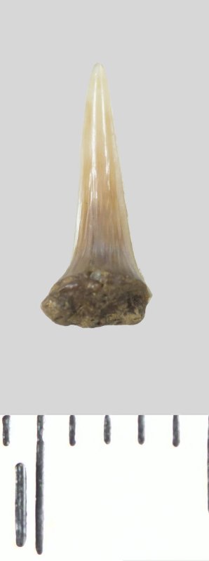 Зуб (фрагмент). Акула. Lamniformes gen. et sp. indet. Классификация: Хордовые Chordata, Позвоночные Vertebrata, Хрящевые рыбы Chondrichthyes, Пластиножаберные Elasmobranchii, Акулы Selachii, Ламнообразные Lamniformes