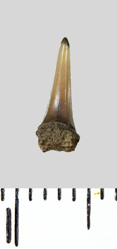 Зуб (фрагмент). Акула. Lamniformes gen. et sp. indet. Классификация: Хордовые Chordata, Позвоночные Vertebrata, Хрящевые рыбы Chondrichthyes, Пластиножаберные Elasmobranchii, Акулы Selachii, Ламнообразные Lamniformes