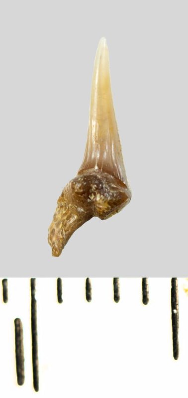 Зуб (фрагмент). Акула. Lamniformes gen. et sp. indet. Классификация: Хордовые Chordata, Позвоночные Vertebrata, Хрящевые рыбы Chondrichthyes, Пластиножаберные Elasmobranchii, Акулы Selachii, Ламнообразные Lamniformes
