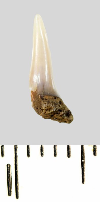 Зуб (фрагмент). Акула. Lamniformes gen. et sp. indet. Классификация: Хордовые Chordata, Позвоночные Vertebrata, Хрящевые рыбы Chondrichthyes, Пластиножаберные Elasmobranchii, Акулы Selachii, Ламнообразные Lamniformes