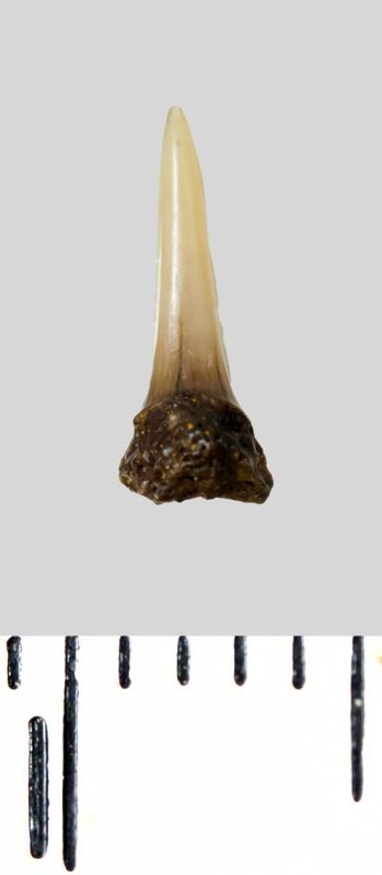 Зуб (фрагмент). Акула. Lamniformes gen. et sp. indet. Классификация: Хордовые Chordata, Позвоночные Vertebrata, Хрящевые рыбы Chondrichthyes, Пластиножаберные Elasmobranchii, Акулы Selachii, Ламнообразные Lamniformes