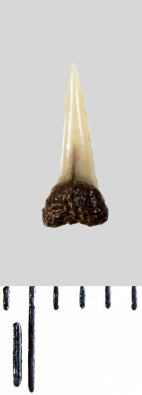 Зуб (фрагмент). Акула. Lamniformes gen. et sp. indet. Классификация: Хордовые Chordata, Позвоночные Vertebrata, Хрящевые рыбы Chondrichthyes, Пластиножаберные Elasmobranchii, Акулы Selachii, Ламнообразные Lamniformes