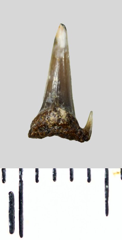 Зуб (фрагмент). Акула. Lamniformes gen. et sp. indet. Классификация: Хордовые Chordata, Позвоночные Vertebrata, Хрящевые рыбы Chondrichthyes, Пластиножаберные Elasmobranchii, Акулы Selachii, Ламнообразные Lamniformes