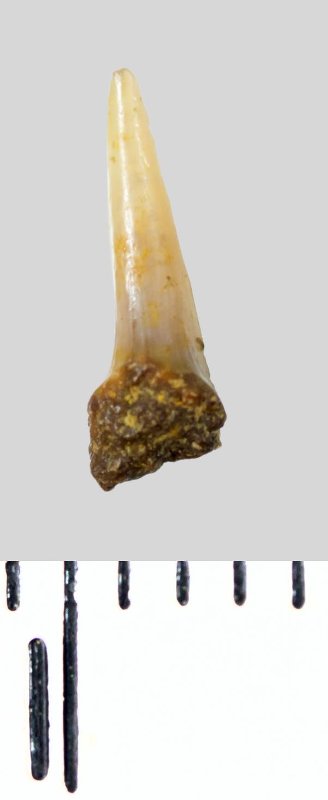 Зуб (фрагмент). Акула. Lamniformes gen. et sp. indet. Классификация: Хордовые Chordata, Позвоночные Vertebrata, Хрящевые рыбы Chondrichthyes, Пластиножаберные Elasmobranchii, Акулы Selachii, Ламнообразные Lamniformes