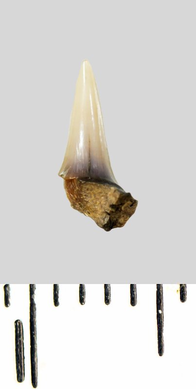 Зуб (фрагмент). Акула. Lamniformes gen. et sp. indet. Классификация: Хордовые Chordata, Позвоночные Vertebrata, Хрящевые рыбы Chondrichthyes, Пластиножаберные Elasmobranchii, Акулы Selachii, Ламнообразные Lamniformes