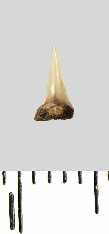 Зуб (фрагмент). Акула. Lamniformes gen. et sp. indet. Классификация: Хордовые Chordata, Позвоночные Vertebrata, Хрящевые рыбы Chondrichthyes, Пластиножаберные Elasmobranchii, Акулы Selachii, Ламнообразные Lamniformes