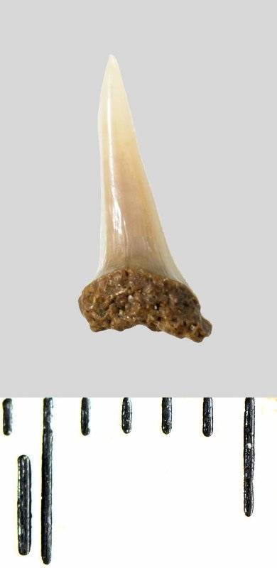 Зуб (фрагмент). Акула. Lamniformes gen. et sp. indet. Классификация: Хордовые Chordata, Позвоночные Vertebrata, Хрящевые рыбы Chondrichthyes, Пластиножаберные Elasmobranchii, Акулы Selachii, Ламнообразные Lamniformes