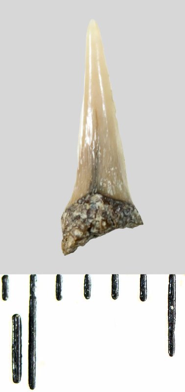 Зуб (фрагмент). Акула. Lamniformes gen. et sp. indet. Классификация: Хордовые Chordata, Позвоночные Vertebrata, Хрящевые рыбы Chondrichthyes, Пластиножаберные Elasmobranchii, Акулы Selachii, Ламнообразные Lamniformes