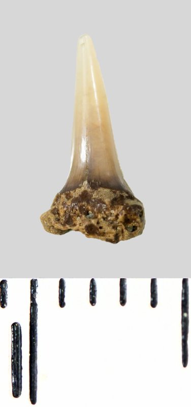 Зуб (фрагмент). Акула. Lamniformes gen. et sp. indet. Классификация: Хордовые Chordata, Позвоночные Vertebrata, Хрящевые рыбы Chondrichthyes, Пластиножаберные Elasmobranchii, Акулы Selachii, Ламнообразные Lamniformes