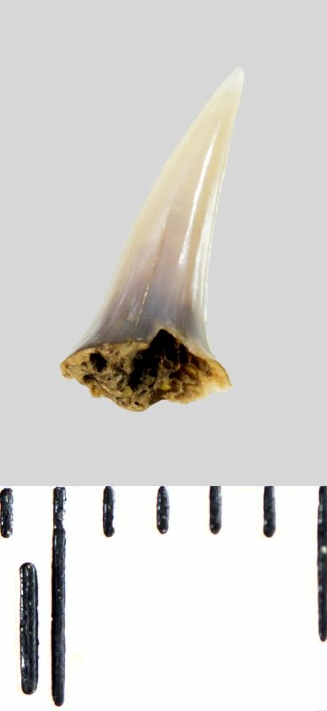 Зуб (фрагмент). Акула. Lamniformes gen. et sp. indet. Классификация: Хордовые Chordata, Позвоночные Vertebrata, Хрящевые рыбы Chondrichthyes, Пластиножаберные Elasmobranchii, Акулы Selachii, Ламнообразные Lamniformes