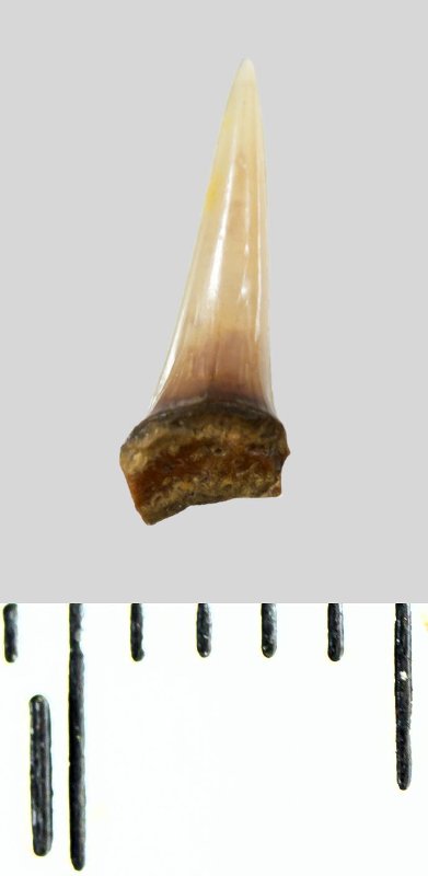 Зуб (фрагмент). Акула. Lamniformes gen. et sp. indet. Классификация: Хордовые Chordata, Позвоночные Vertebrata, Хрящевые рыбы Chondrichthyes, Пластиножаберные Elasmobranchii, Акулы Selachii, Ламнообразные Lamniformes