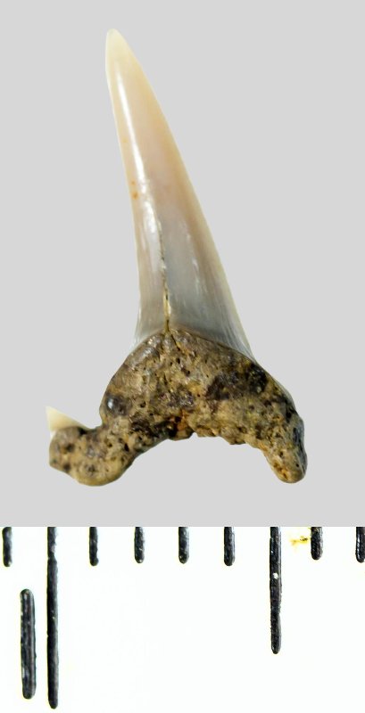 Зуб (фрагмент). Акула. Lamniformes gen. et sp. indet. Классификация: Хордовые Chordata, Позвоночные Vertebrata, Хрящевые рыбы Chondrichthyes, Пластиножаберные Elasmobranchii, Акулы Selachii, Ламнообразные Lamniformes