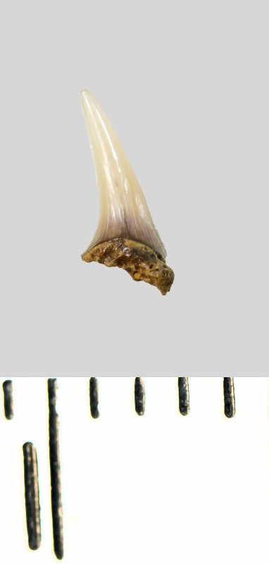 Зуб (фрагмент). Акула. Lamniformes gen. et sp. indet. Классификация: Хордовые Chordata, Позвоночные Vertebrata, Хрящевые рыбы Chondrichthyes, Пластиножаберные Elasmobranchii, Акулы Selachii, Ламнообразные Lamniformes
