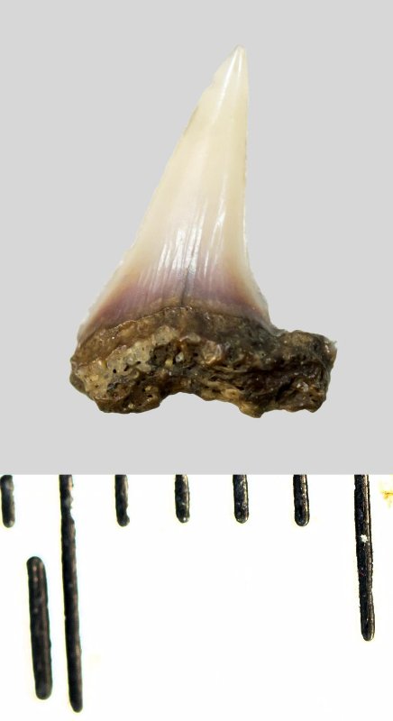 Зуб (фрагмент). Акула. Lamniformes gen. et sp. indet. Классификация: Хордовые Chordata, Позвоночные Vertebrata, Хрящевые рыбы Chondrichthyes, Пластиножаберные Elasmobranchii, Акулы Selachii, Ламнообразные Lamniformes