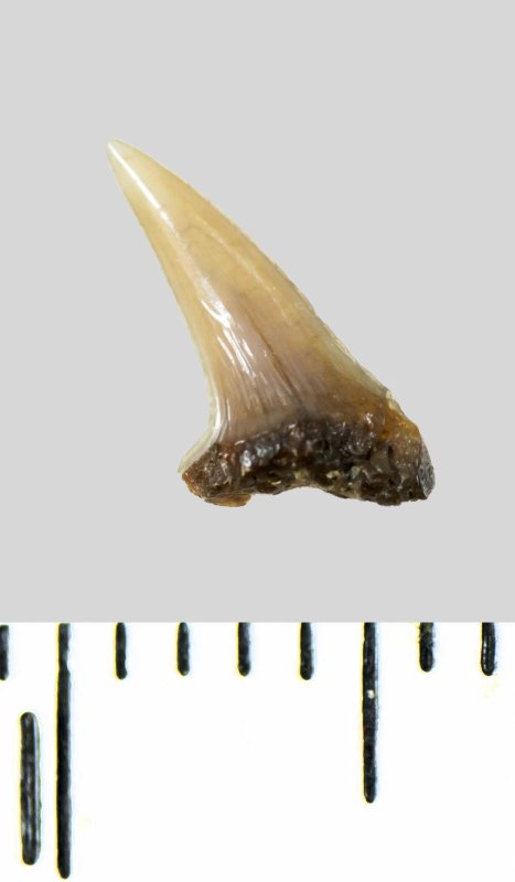 Зуб (фрагмент). Акула. Lamniformes gen. et sp. indet. Классификация: Хордовые Chordata, Позвоночные Vertebrata, Хрящевые рыбы Chondrichthyes, Пластиножаберные Elasmobranchii, Акулы Selachii, Ламнообразные Lamniformes