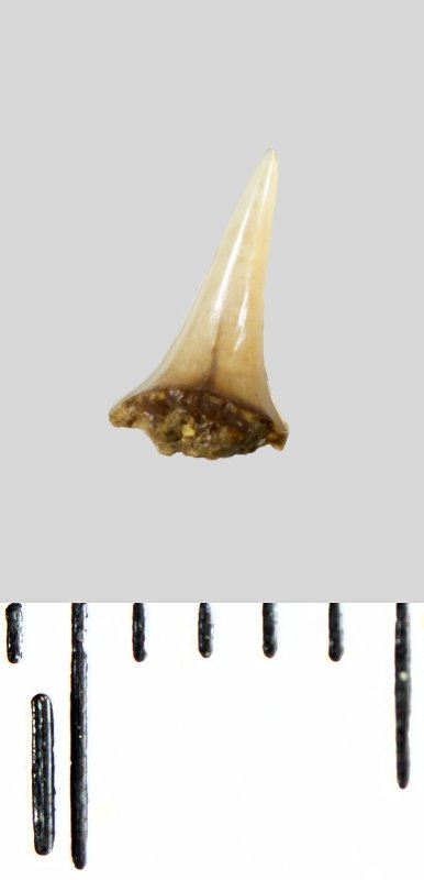 Зуб (фрагмент). Акула. Lamniformes gen. et sp. indet. Классификация: Хордовые Chordata, Позвоночные Vertebrata, Хрящевые рыбы Chondrichthyes, Пластиножаберные Elasmobranchii, Акулы Selachii, Ламнообразные Lamniformes