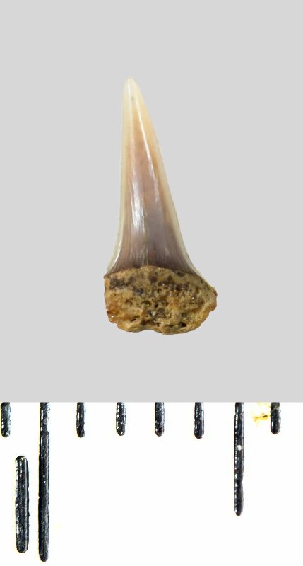 Зуб (фрагмент). Акула. Lamniformes gen. et sp. indet. Классификация: Хордовые Chordata, Позвоночные Vertebrata, Хрящевые рыбы Chondrichthyes, Пластиножаберные Elasmobranchii, Акулы Selachii, Ламнообразные Lamniformes