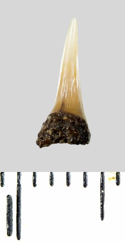Зуб (фрагмент). Акула. Lamniformes gen. et sp. indet. Классификация: Хордовые Chordata, Позвоночные Vertebrata, Хрящевые рыбы Chondrichthyes, Пластиножаберные Elasmobranchii, Акулы Selachii, Ламнообразные Lamniformes