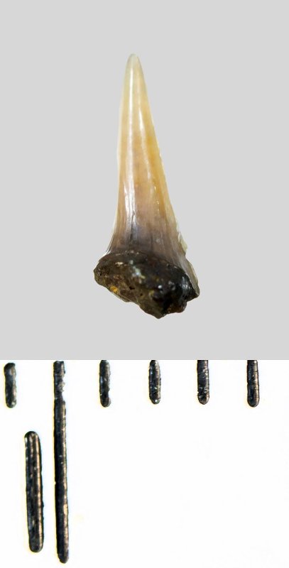 Зуб (фрагмент). Акула. Lamniformes gen. et sp. indet. Классификация: Хордовые Chordata, Позвоночные Vertebrata, Хрящевые рыбы Chondrichthyes, Пластиножаберные Elasmobranchii, Акулы Selachii, Ламнообразные Lamniformes