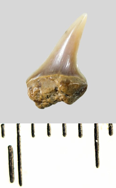 Зуб (фрагмент). Акула. Lamniformes gen. et sp. indet. Классификация: Хордовые Chordata, Позвоночные Vertebrata, Хрящевые рыбы Chondrichthyes, Пластиножаберные Elasmobranchii, Акулы Selachii, Ламнообразные Lamniformes