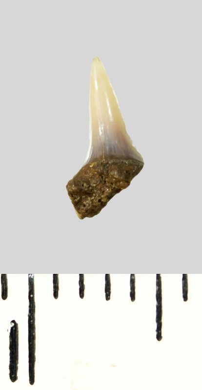 Зуб (фрагмент). Акула. Lamniformes gen. et sp. indet. Классификация: Хордовые Chordata, Позвоночные Vertebrata, Хрящевые рыбы Chondrichthyes, Пластиножаберные Elasmobranchii, Акулы Selachii, Ламнообразные Lamniformes