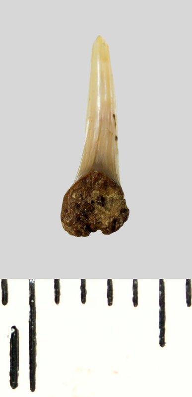 Зуб (фрагмент). Акула. Lamniformes gen. et sp. indet. Классификация: Хордовые Chordata, Позвоночные Vertebrata, Хрящевые рыбы Chondrichthyes, Пластиножаберные Elasmobranchii, Акулы Selachii, Ламнообразные Lamniformes