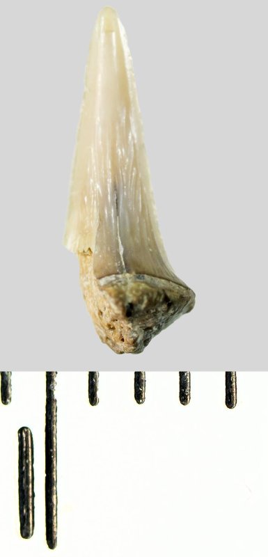Зуб (фрагмент). Акула. Lamniformes gen. et sp. indet. Классификация: Хордовые Chordata, Позвоночные Vertebrata, Хрящевые рыбы Chondrichthyes, Пластиножаберные Elasmobranchii, Акулы Selachii, Ламнообразные Lamniformes
