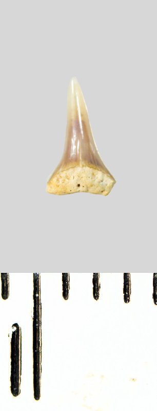 Зуб (фрагмент). Акула. Lamniformes gen. et sp. indet. Классификация: Хордовые Chordata, Позвоночные Vertebrata, Хрящевые рыбы Chondrichthyes, Пластиножаберные Elasmobranchii, Акулы Selachii, Ламнообразные Lamniformes