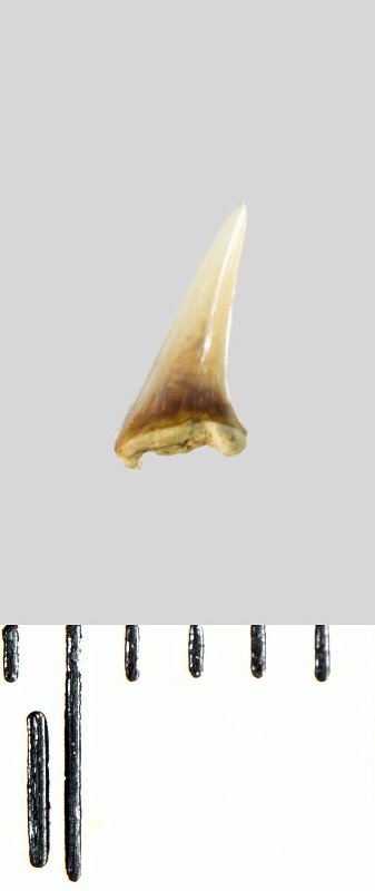 Зуб (фрагмент). Акула. Lamniformes gen. et sp. indet. Классификация: Хордовые Chordata, Позвоночные Vertebrata, Хрящевые рыбы Chondrichthyes, Пластиножаберные Elasmobranchii, Акулы Selachii, Ламнообразные Lamniformes