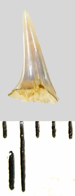 Зуб (фрагмент). Акула. Lamniformes gen. et sp. indet. Классификация: Хордовые Chordata, Позвоночные Vertebrata, Хрящевые рыбы Chondrichthyes, Пластиножаберные Elasmobranchii, Акулы Selachii, Ламнообразные Lamniformes