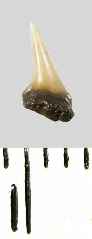 Зуб (фрагмент). Акула. Lamniformes gen. et sp. indet. Классификация: Хордовые Chordata, Позвоночные Vertebrata, Хрящевые рыбы Chondrichthyes, Пластиножаберные Elasmobranchii, Акулы Selachii, Ламнообразные Lamniformes